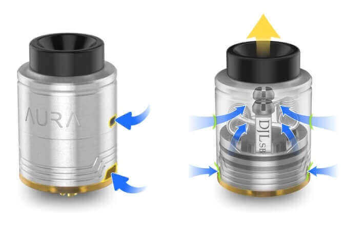 Le Aura RDA utilise un double système d'airflow (side et bottom airflow) réglables indépendamment l'un de l'autre permettant au flux d'air de venir entourer le coil.